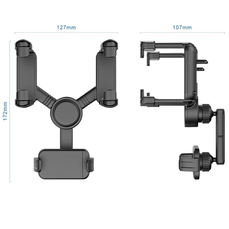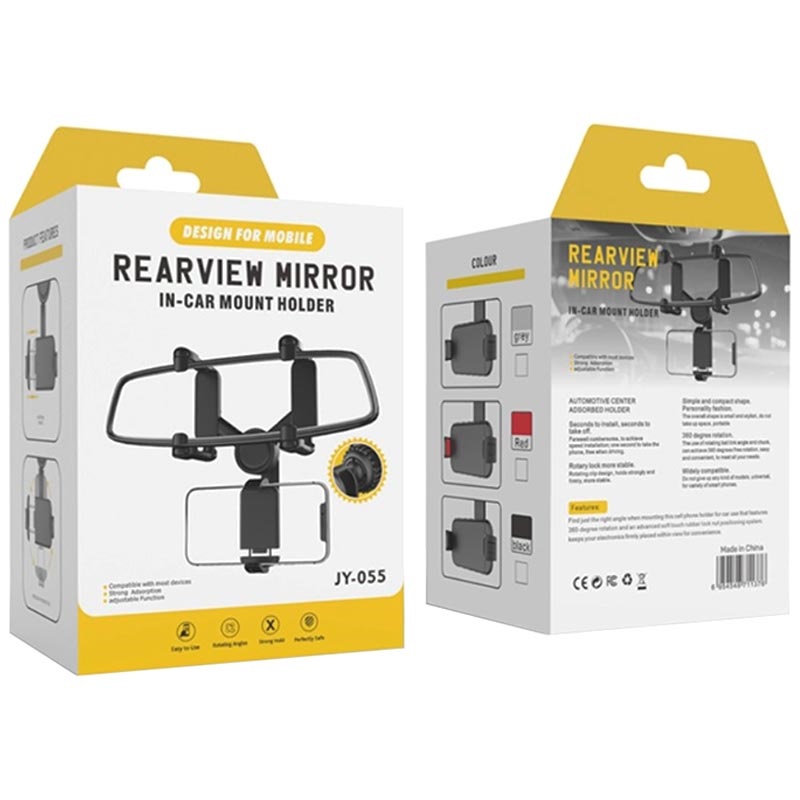 Justerbar telefonholder med 360 graders roterende funksjon. Enkel installasjon og fjerning, fest til bakspeilet, og de fire klemmene låses godt på speilet. Den er laget av slitesterkt, solid og høykvalitets ABS-materiale. Bilholderen JY-055 er også egnet for enheter fra 65mm til 95mm.