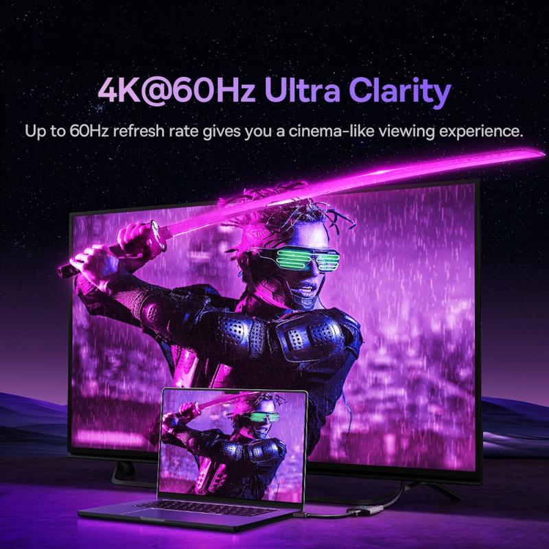 - 4K@60 Hz Ultra HD-utgang: Leverer levende, detaljerte bilder for spill, strømming og presentasjoner.