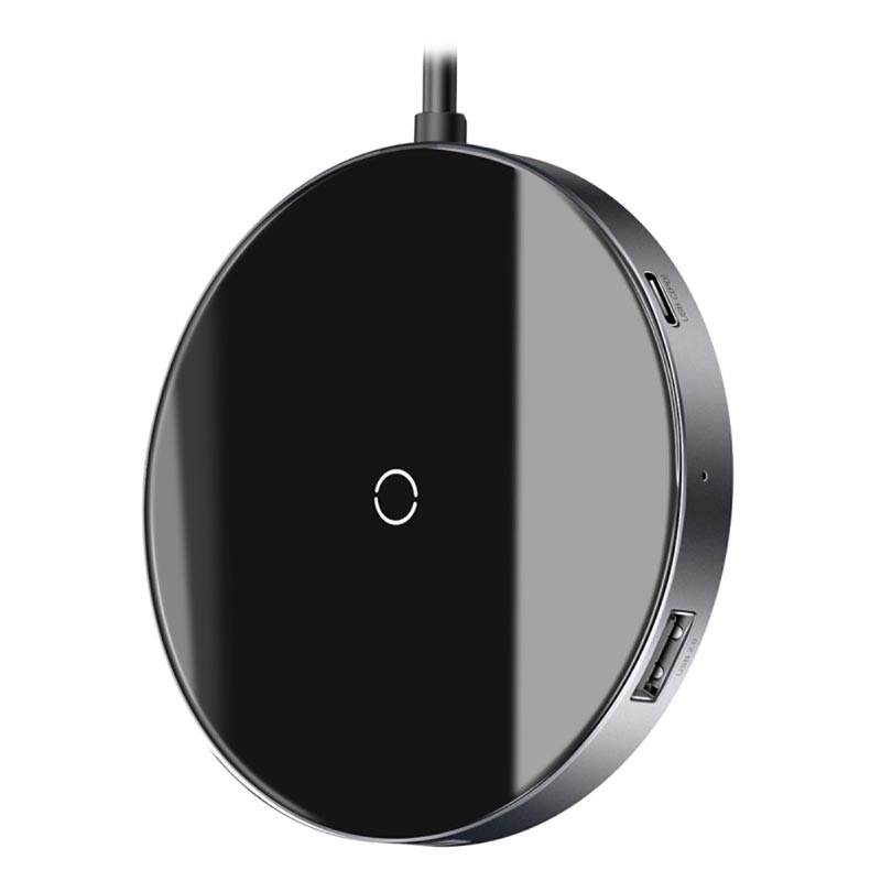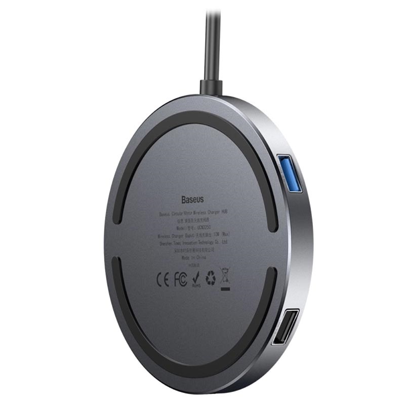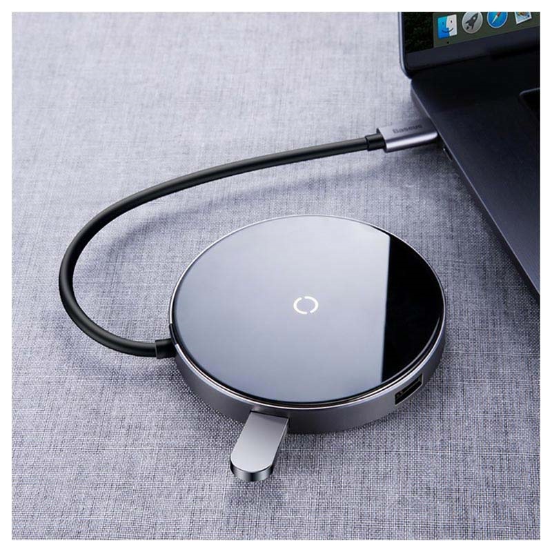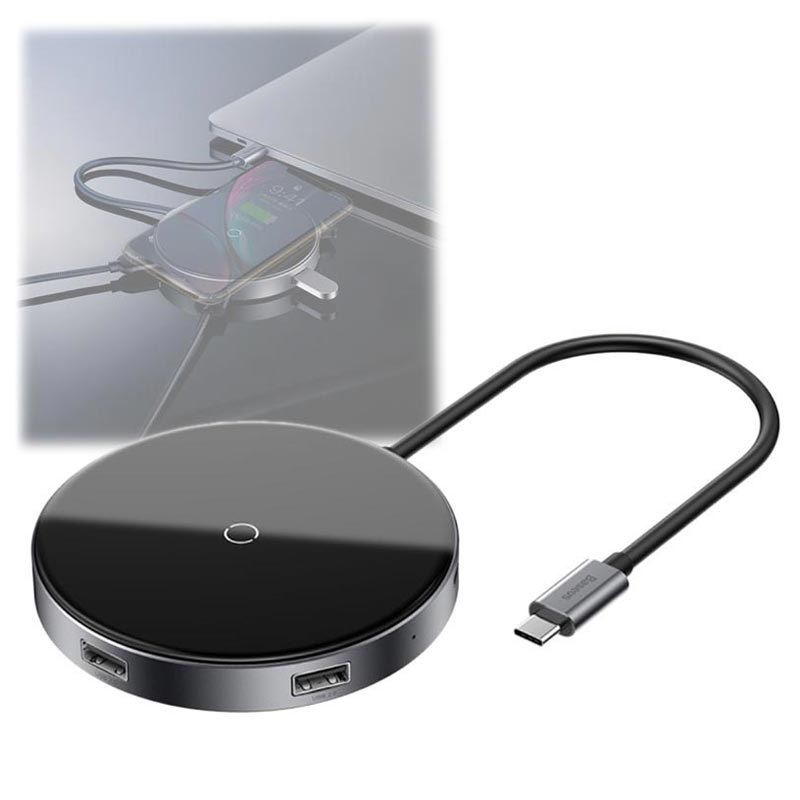 Baseus Circular Mirror 6-i-1 Qi Trådløs Lader og Hub med Type-C PD, 4 USB-Porter - 10W, 60W, 5Gbps, 480Mbps