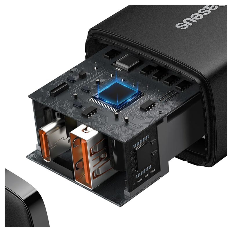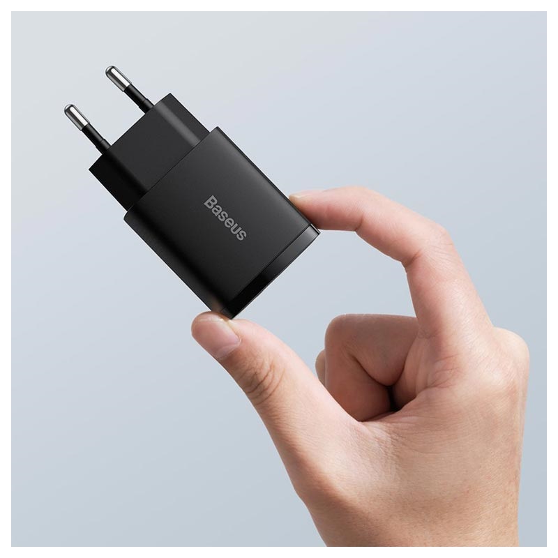 - Baseus Compact USB-C og USB-A rask strømadapter med EU-plugg