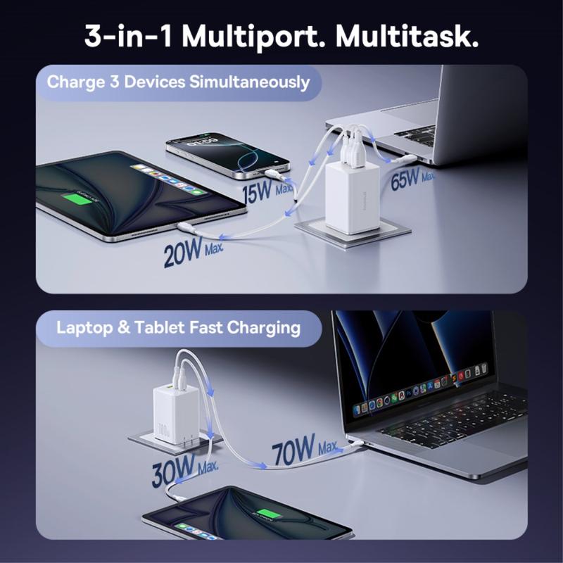 - Intelligent strømfordeling: 70 W + 30 W på dobbel USB-C, eller 65 W + 20 W + 15 W over alle tre portene