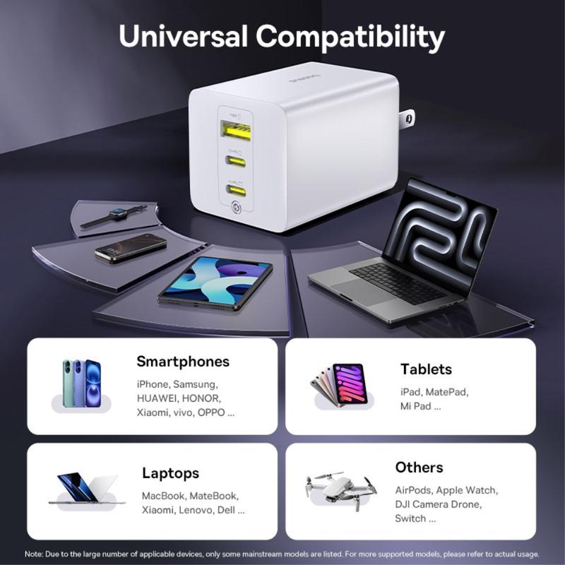 - Tre i ett-design: USB-C1-, USB-C2- og USB-A-porter lader flere enheter samtidig