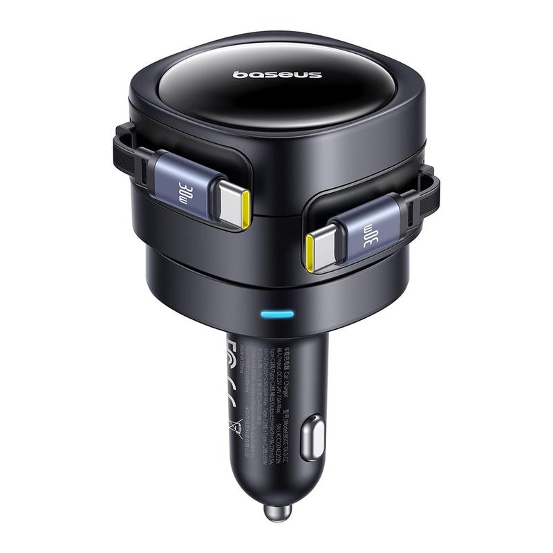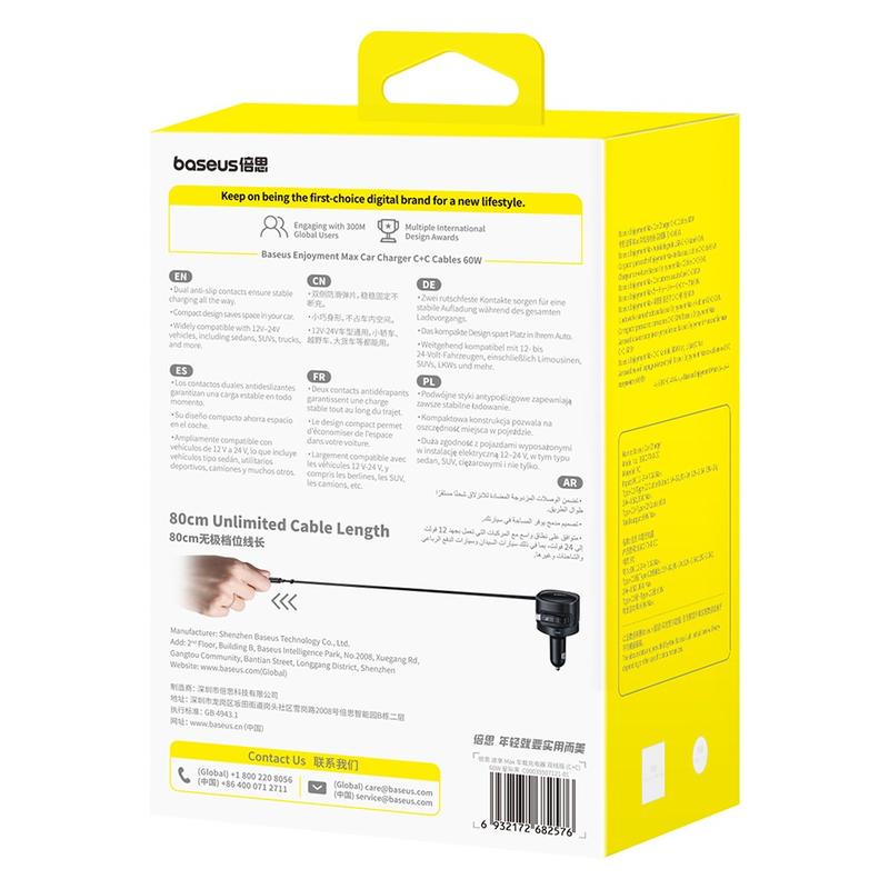 Baseus Enjoyment Max billader leverer kraftig 60W hurtiglading med to uttrekkbare Type-C-kabler, noe som sikrer maksimal bekvemmelighet når du er på farten. Den innovative, roterbare designen gjør det enkelt å bruke den i alle biloppsett, og de uttrekkbare kablene forhindrer rot. Denne laderen er kompatibel med flere enheter, og er ideell for travle fagfolk og folk som ofte er på reise, og som er på utkikk etter effektive ladeløsninger.
