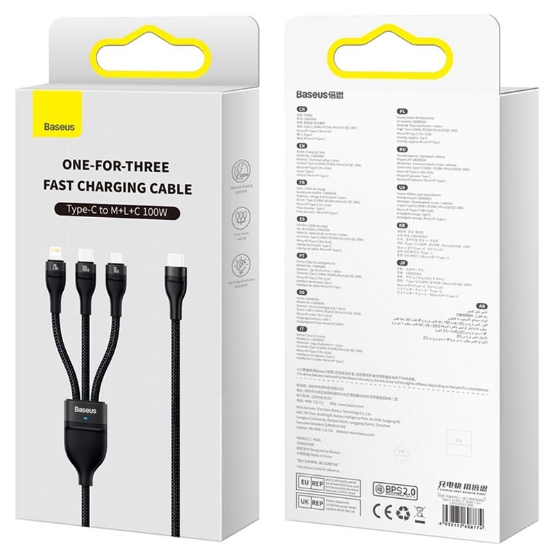 Baseus Flash Series II 3-i-1 Rask Ladekabel - Lightning, USB-C, microUSB - 100W, 1.5m