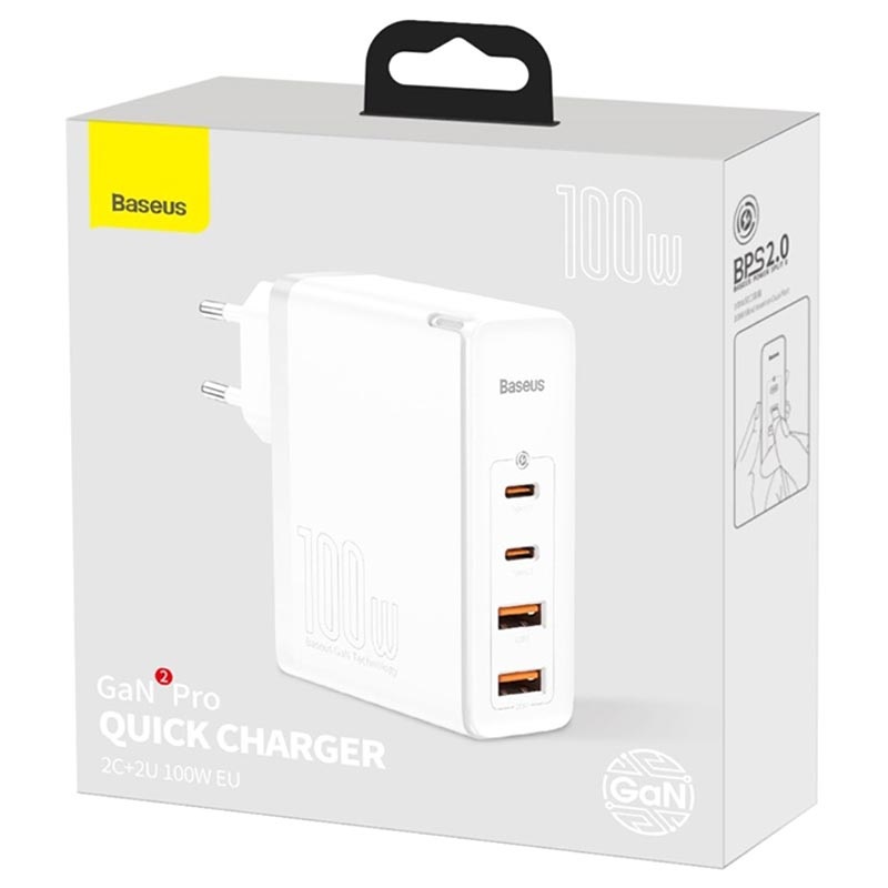 Baseus GaN2 Pro 2xUSB & 2xUSB-C Rask Lader med USB-C Kabel - QC4+/3.0, PD3.0, Huawei SCP/FCP, Samsung AFS, Apple 2.4 - 100W