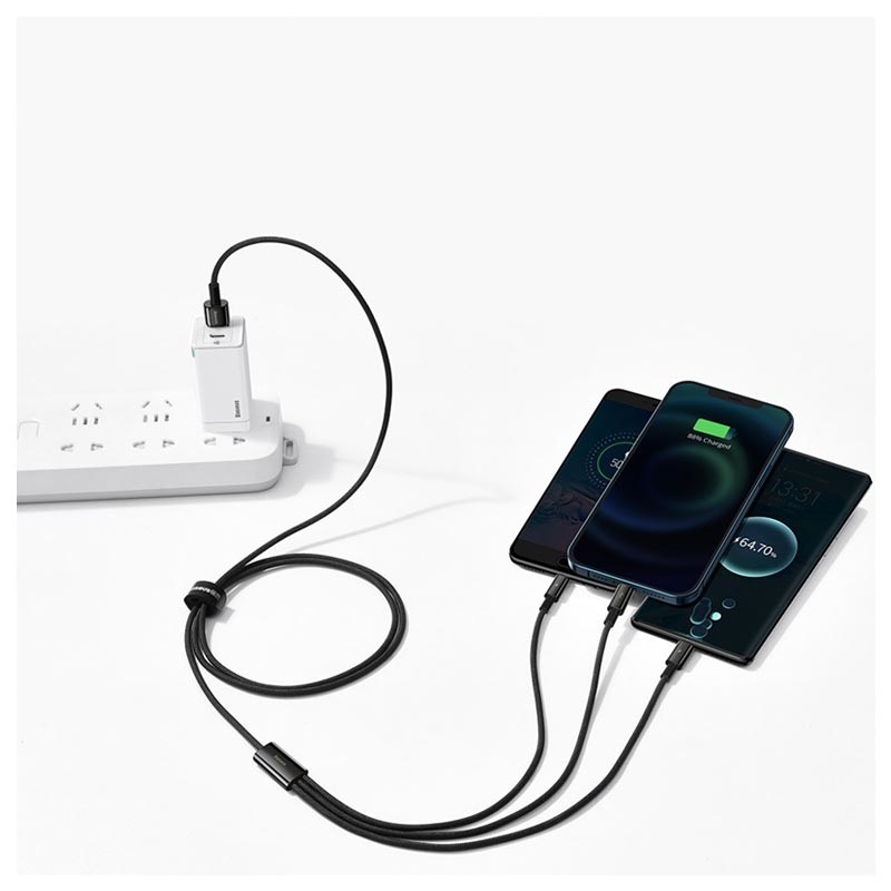 Lad opp enhetene dine raskt ved å koble denne kabelen fra Baseus til USB-porten på PC-en eller veggladeren. 3 forskjellige porter lar deg lade 3 smarttelefoner raskt samtidig! Dette er et perfekt tilbehør for alle enheter med USB Type C, Micro USB og Lightning-porter.
