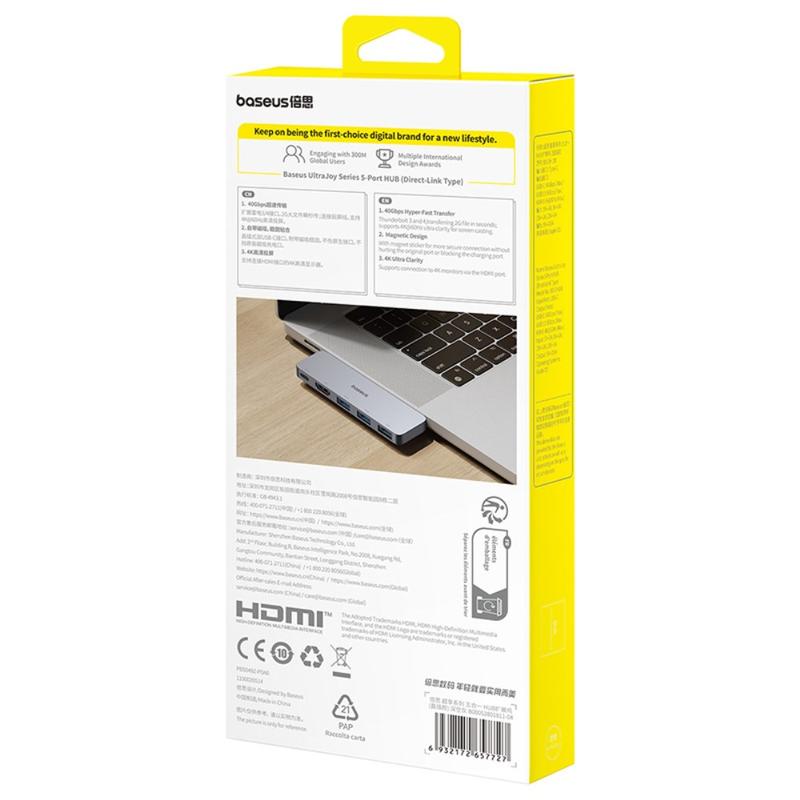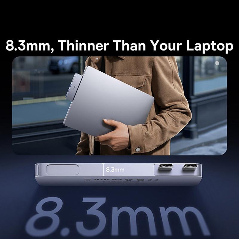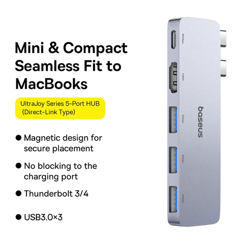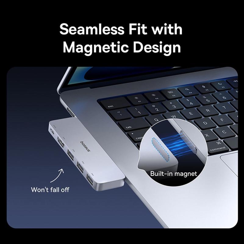 BASEUS UltraJoy 40 Gbps USB-C Multiport Hub gir deg alt du trenger for en ryddig og høytytende arbeidsplass. De høye overføringshastighetene, den robuste strømforsyningen og det allsidige utvalget av porter gjør den til den ultimate følgesvennen for daglige oppgaver eller mer krevende kreative prosjekter. Den magnetiske designen er ekstra praktisk og sørger for et stabilt, organisert oppsett uansett hvor du er.