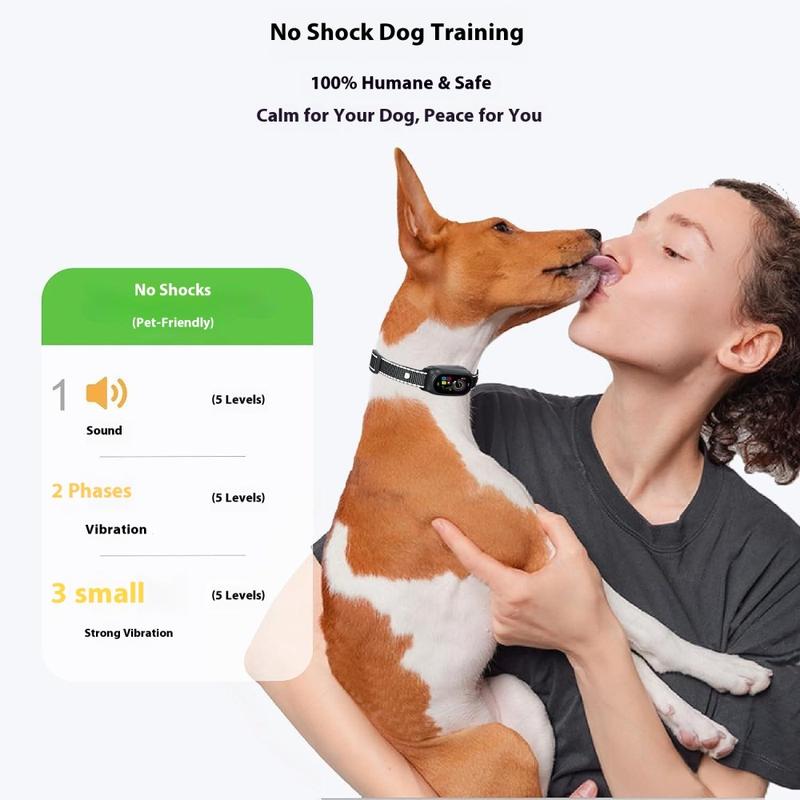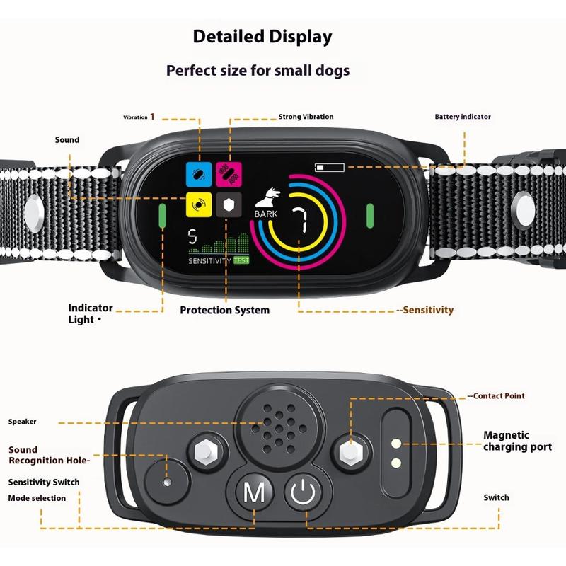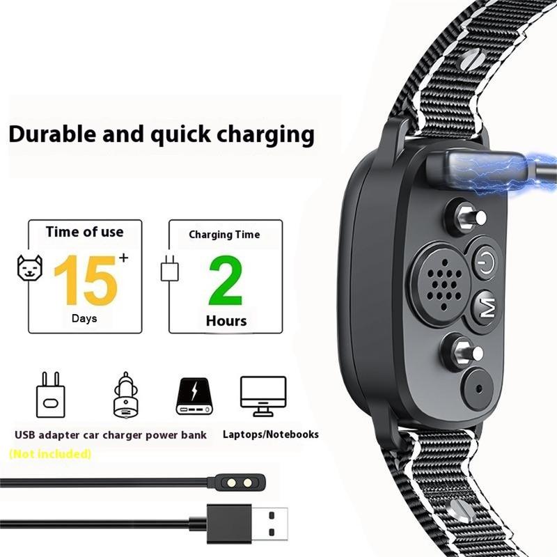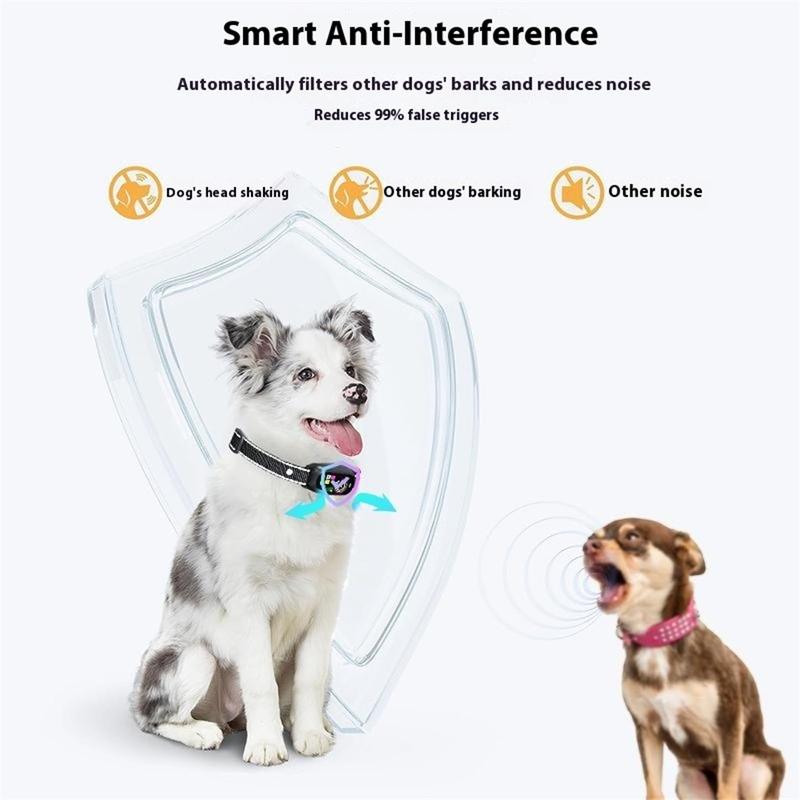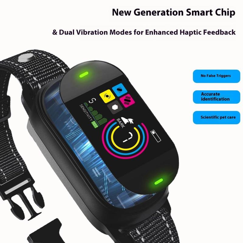 Halsbåndet er utstyrt med et smart stemmegjenkjenningssystem som skiller mellom hundens bjeffing og andre lyder for å unngå falske utløsere. En automatisk hvilemodus sikrer hundens komfort og forhindrer overstimulering under trening.