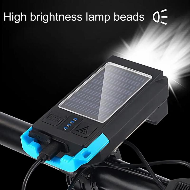 BG-1706 USB+Solar oppladbare sykkellys Vanntett 6 lysmoduser Dobbel frontlykt for sykkel med hornalarm - Rød