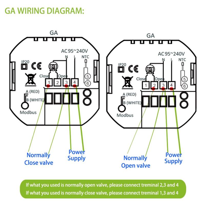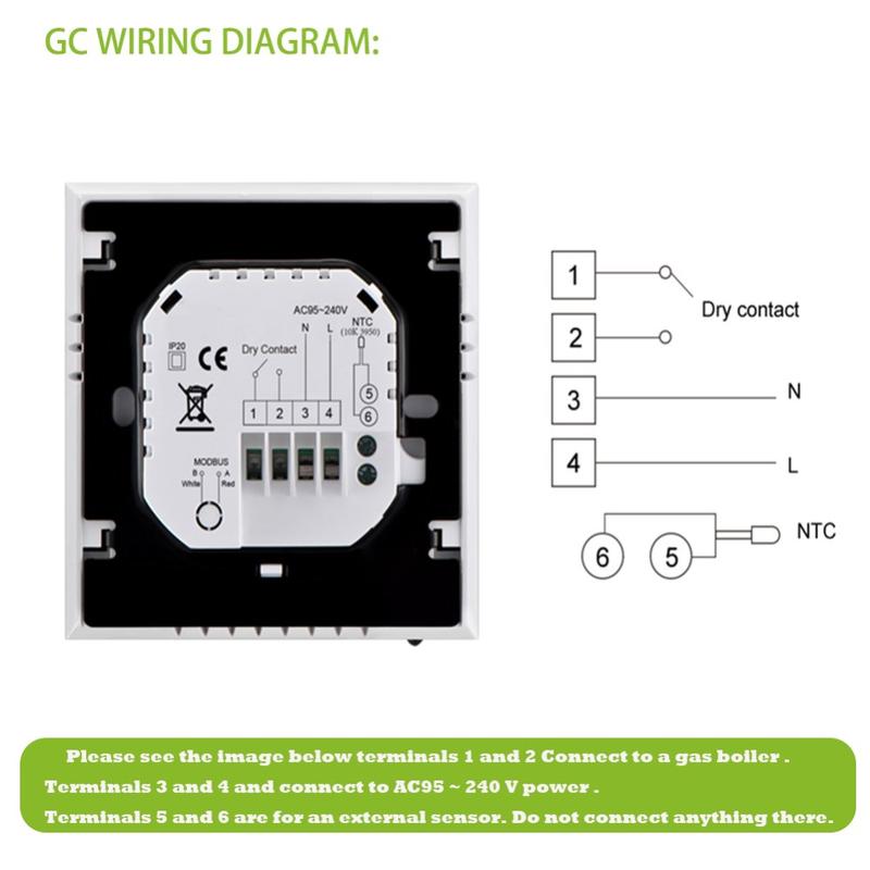 Denne termostaten er laget av slitesterkt, flammehemmende PC+ABS-materiale og er designet for langvarig ytelse og stabil drift. Strømbruddsbeskyttelse bidrar til å bevare de lagrede innstillingene dine, noe som reduserer behovet for å konfigurere enheten på nytt etter avbrudd. Det innebygde installasjonsformatet passer til en standard 86 x 86 mm veggboks eller en konvensjonell europeisk boks, noe som gjør den egnet for et bredt spekter av interiører.