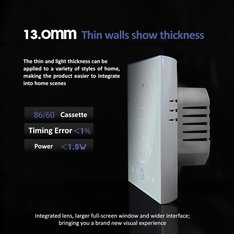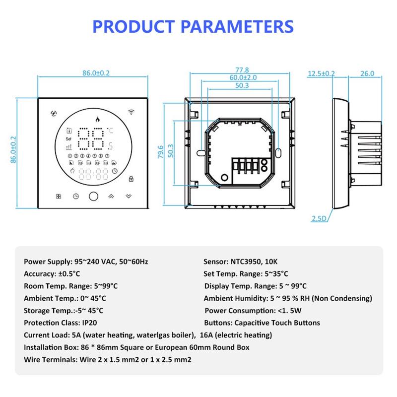 - Nøyaktig temperaturkontroll: Har en NTC3950, 10K-sensor med høy presisjon og en temperaturfeilmargin på ±1 °C, noe som sikrer jevn innendørs komfort.