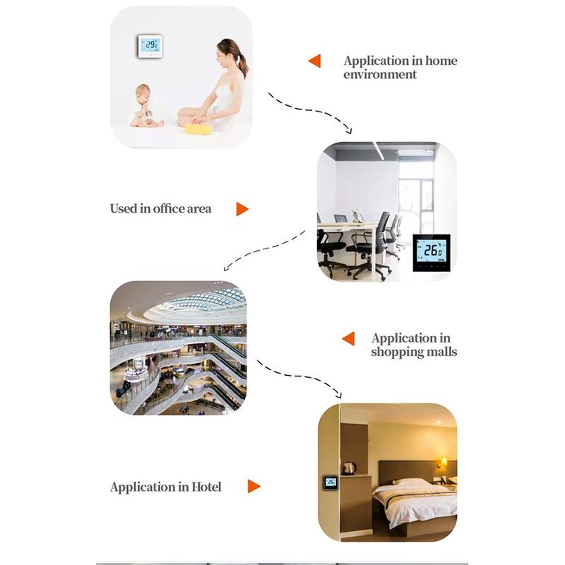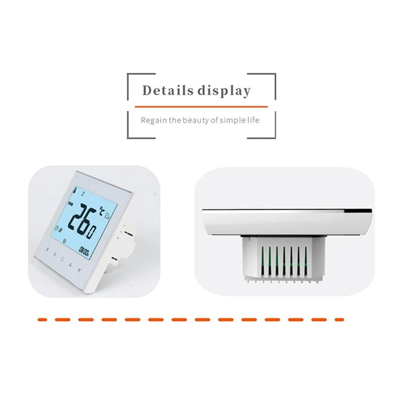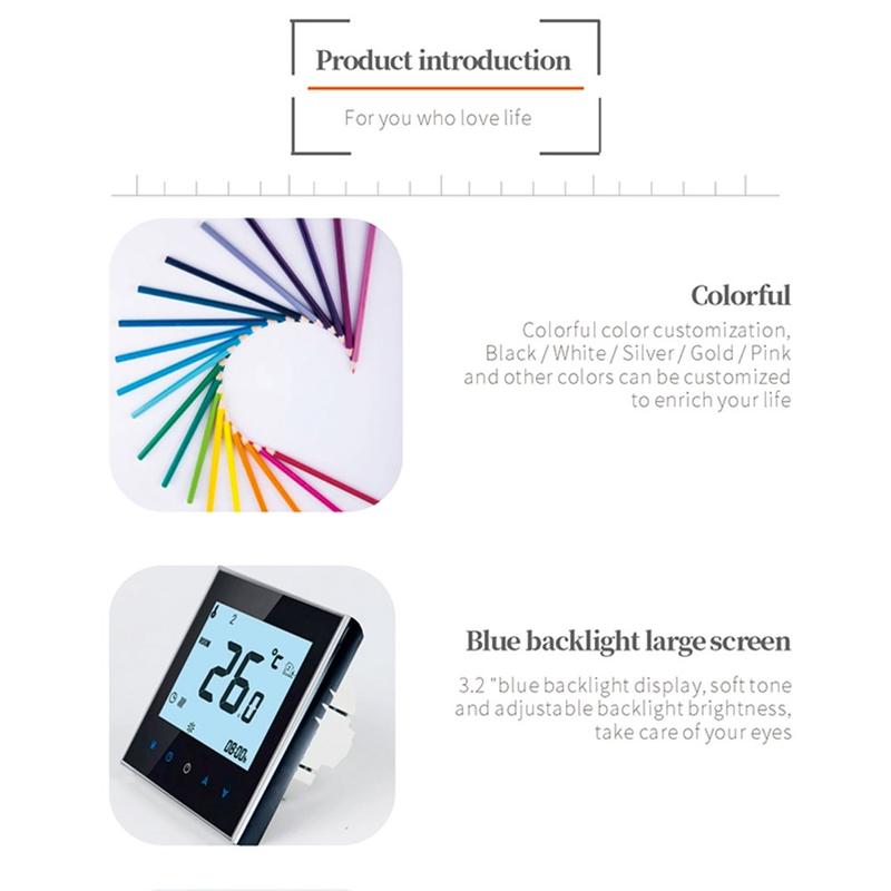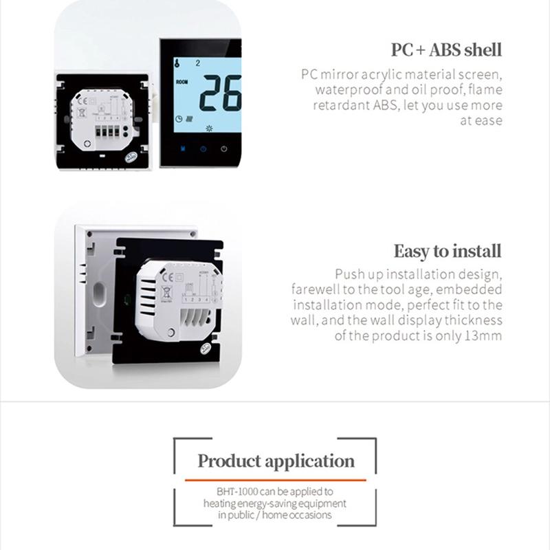 BHT-1000GB Smart Termostat er utviklet for å gi presis og stabil regulering av elektriske gulvvarmesystemer i boliger, hoteller, leiligheter og andre innendørsarealer. Med nøyaktig temperaturregulering og et praktisk berøringsgrensesnitt bidrar den til å skape et mer behagelig inneklima, samtidig som den enkle daglige bruken opprettholdes. Den moderne panelutformingen gjør den til et elegant og funksjonelt tilskudd til en rekke ulike interiører.