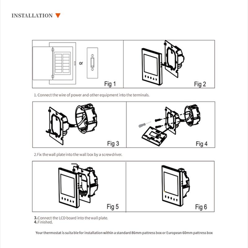 BHT-1000GB er designet for installasjon i en standard 86 x 86 mm innfelt boks eller en konvensjonell europeisk veggboks, noe som gjør den enkel å integrere i mange eksisterende oppsett. Den brede spenningskompatibiliteten gir også installasjonsfleksibilitet, slik at den kan brukes i et bredt spekter av miljøer der elektrisk gulvvarme benyttes.