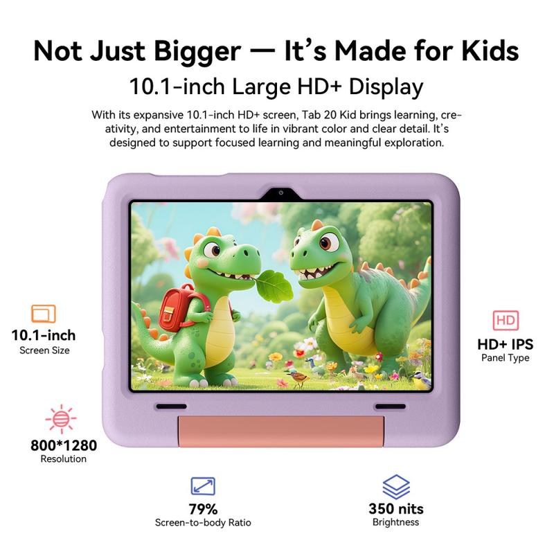 BLACKVIEW Tab 20 Kids har en romslig 10.1-tommers IPS HD-skjerm (800 × 1280) som gir klare bilder, noe som gjør den ideell for pedagogiske apper, videoer, kreativ læring og barnevennlig underholdning.