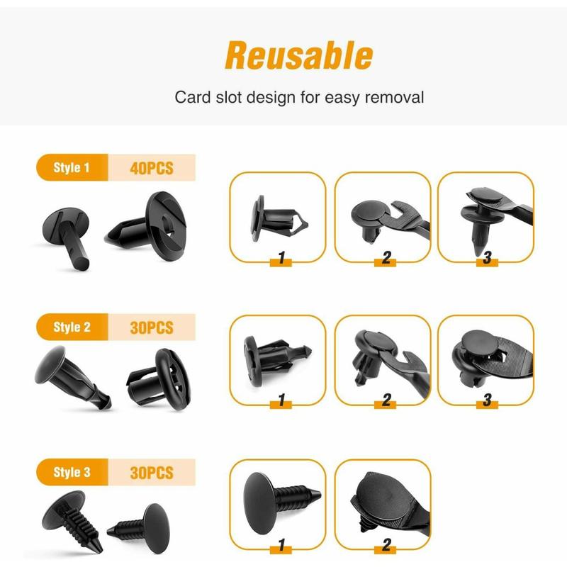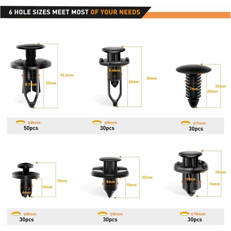 Sikre og beskytt bilens innvendige og utvendige komponenter med dette 200-delers settet med dørpanelfester i blandet plast. Disse slitesterke klipsene har seks forskjellige størrelser for å passe til en rekke ulike biler, og de er perfekte for dørlister, støtfangere, skjermer, sideskjørt, griller og mer. Det medfølgende lirkeverktøyet sørger for problemfri fjerning og montering av klipsene uten å skade de omkringliggende overflatene.