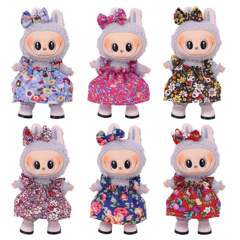 Blomstret festkjole og pannebånd med sløyfe til 17cm Labubu minifigur - lett antrekk i bomullsblanding, enkel design
