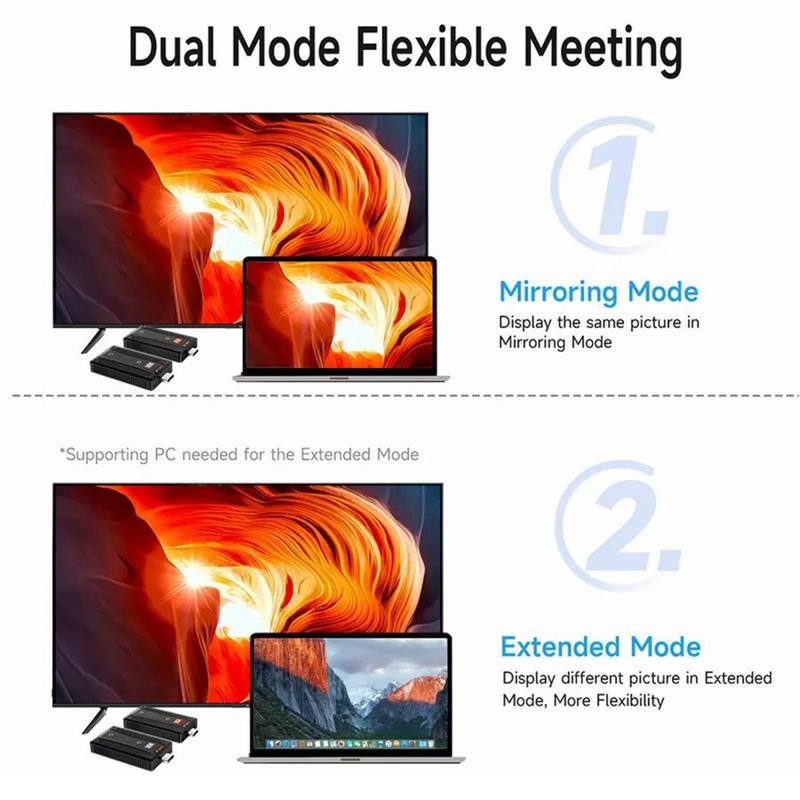 BOVBOX 090 Wireless HD Transmitter and Receiver Kit gir deg videooverføring av høy kvalitet uten problemer med lange kabler. Dette settet er designet for hjemmeunderholdning, presentasjoner og profesjonelle AV-oppsett, og leverer stabil HD-strømming på avstander på opptil 200meter med praktisk talt ingen ventetid. Plugg det inn, og du er klar til å strømme fra bærbar PC til projektor, TV eller skjerm på få sekunder.
