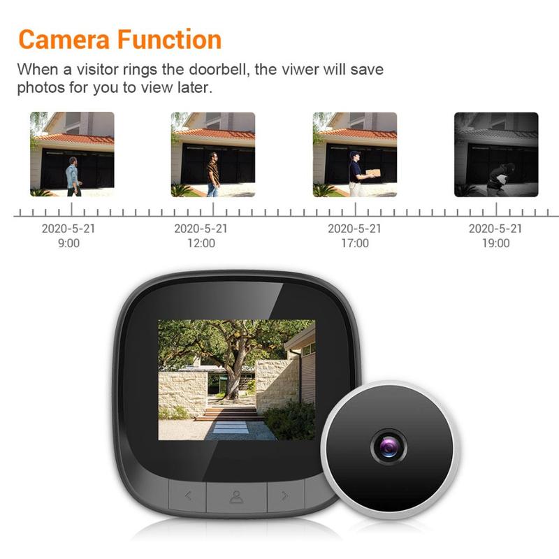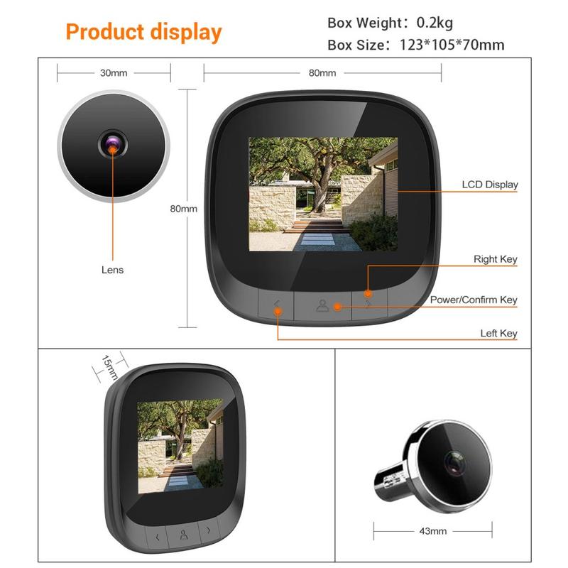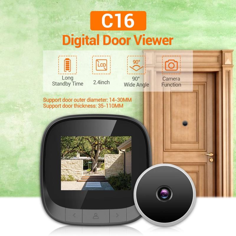 C16 2,4-tommers Smart Door Viewer tilbyr en HD-løsning med vidvinkelvisning for sikkerhet i hjemmet. Med en 2,4-tommers TFT LCD-skjerm, 0,3 MP kikkhullskamera og innebygd fotolagring kan du se besøkende tydelig og registrere hvem som kommer til døren din.