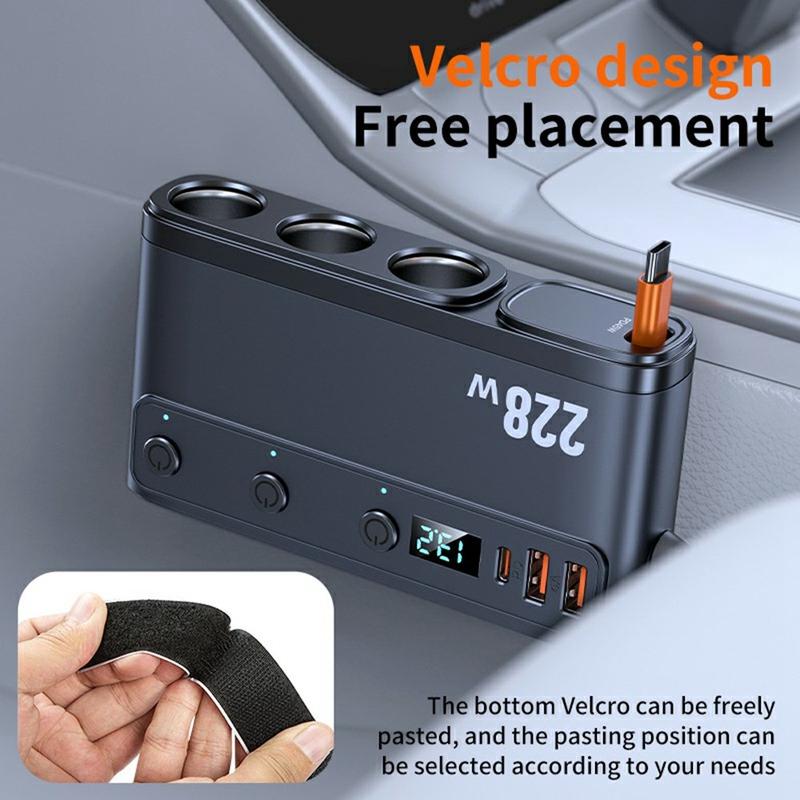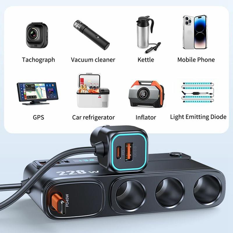 C35L 3-i-1 hurtigladende billader med uttrekkbar kabel og spenningsdisplay - 228W adapter for sigarettenner med flere porter