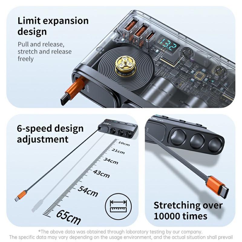 - Uttrekkbar Type-C-kabel - Innebygd kabel som kan forlenges fra 65 cm til 100 cm for fleksibel lading.