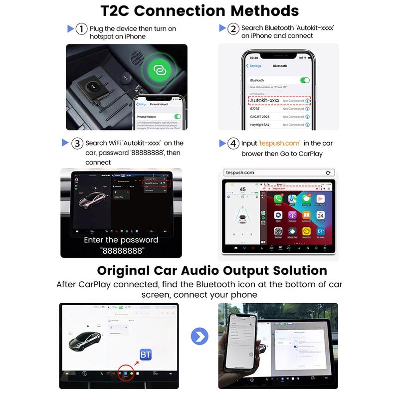 Støtter telefoner: Den trådløse carplay-adapteren er egnet for iPhone 6 og nyere, Android 11 og nyere, iOS 10 eller nyere, og passer for biler med fabrikkinnbygd kablet carplay. For Tesla-modeller. Disse bilene må ha kablet CarPlay-funksjonalitet fra fabrikken.