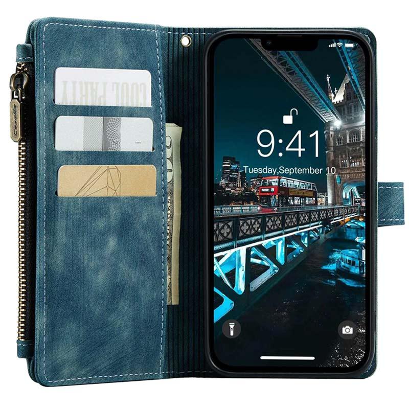 Dette multifunksjonelle lommebok-dekselet til iPhone 14 Plus vil gjøre deg målløs! Designet med ti kortspor, ett kontantspor og en glidelåslomme - nok til å bære det viktigste overalt! Det er laget av et kvalitetspolyuretan og indre TPU-materiale, sikret med magnetisk lukking. Det kommer også med en håndstropp for mer uanstrengt bruk, og det kan brukes som en bakstøtte for å nyte å se videoer håndfritt.