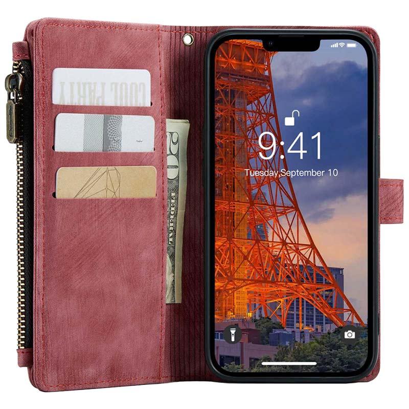 Dette multifunksjonelle lommebok-dekselet til iPhone 14 Plus vil gjøre deg målløs! Designet med ti kortspor, ett kontantspor og en glidelåslomme - nok til å bære det viktigste overalt! Det er laget av et kvalitetspolyuretan og indre TPU-materiale, sikret med magnetisk lukking. Det kommer også med en håndstropp for mer uanstrengt bruk, og det kan brukes som en bakstøtte for å nyte å se videoer håndfritt.