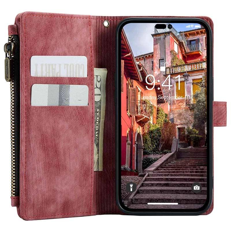 Dette multifunksjonelle lommebok-dekselet til iPhone 14 Pro vil gjøre deg målløs! Designet med ti kortspor, ett kontantspor og en glidelåslomme - nok til å bære det viktigste overalt! Det er laget av et kvalitetspolyuretan og indre TPU-materiale, sikret med magnetisk lukking. Det kommer også med en håndstropp for mer uanstrengt bruk, og det kan brukes som en bakstøtte for å nyte å se videoer håndfritt.