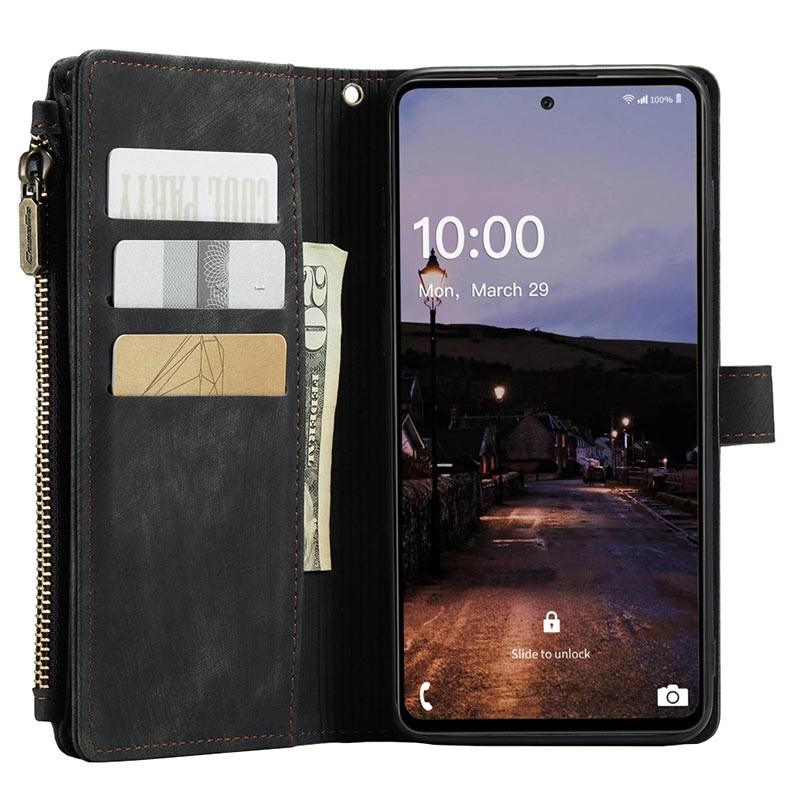 Dette multifunksjonelle lommebok-dekselet til Samsung Galaxy A33 5G vil gjøre deg målløs! Designet med ti kortspor, ett kontantspor og en glidelåslomme - nok til å bære det viktigste overalt! Det er laget av et kvalitetspolyuretan og indre TPU-materiale, sikret med magnetisk lukking. Det kommer også med en håndstropp for mer uanstrengt bruk, og det kan brukes som en bakstøtte for å nyte å se videoer håndfritt.