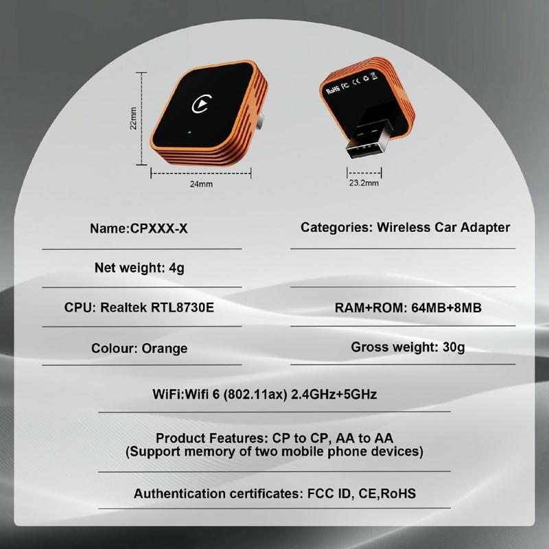 CP030-3 er bygget for kompatibilitet med både iPhone- og Android-enheter og støtter trådløs CarPlay og Android Auto for jevnere daglig bruk på veien. Den kompakte designen gjør det enkelt å la den være koblet til i bilen eller flytte den mellom biler når det er nødvendig, mens den lette konstruksjonen og den holdbare aluminiumslegeringen og akrylkonstruksjonen bidrar til pålitelig bruk under skiftende forhold i bilen. Med støtte for BT 5.3 og trådløs overføring er den designet for å opprettholde stabil kommunikasjon mellom telefonen din og bilsystemet.