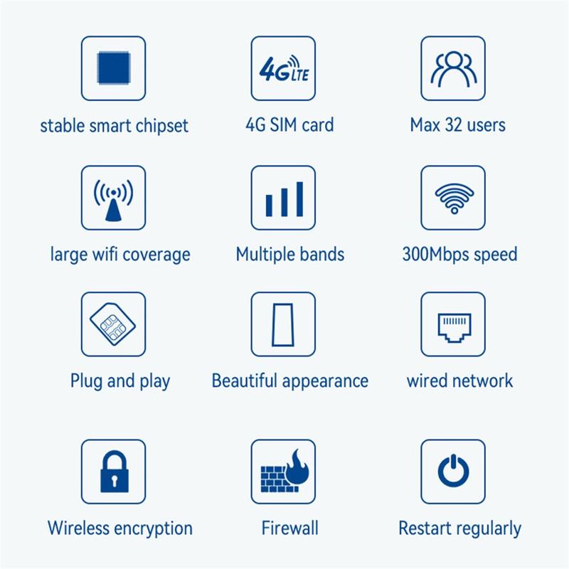 Konverter 4G-signalet ditt til et Wi-Fi-hotspot med en rekkevidde på 20-30 meter. Ruteren støtter opptil 32 enheter samtidig, noe som gjør den ideell for husholdninger, små kontorer og delte rom.