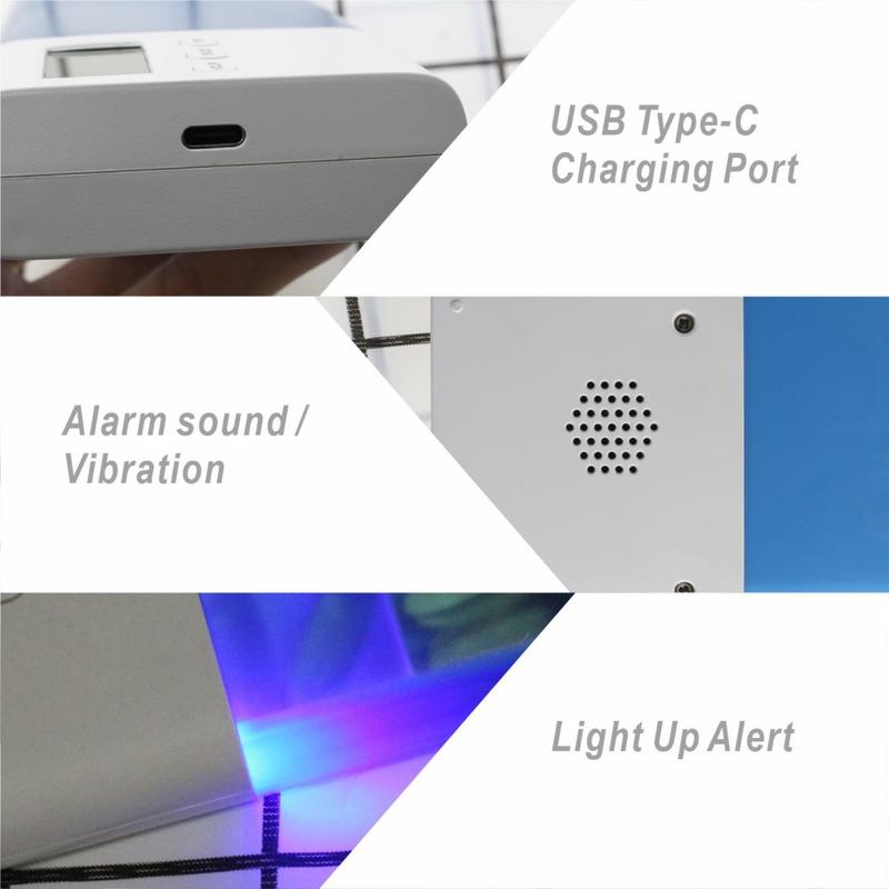 CR-250 forener pilleetui, vibrasjonsalarm, nedtellingstimer og reiselader i én og samme 155 g-enhet, noe som sparer plass, eliminerer engangsbatterier og sikrer at du aldri glemmer en dose. Den BPA-frie, forseglede konstruksjonen oppfyller EUs strenge helsestandarder, noe som gjør den til en smart oppgradering i forhold til spinkle plastholdere.