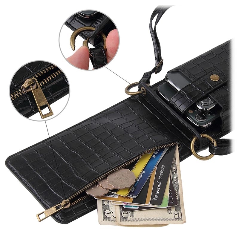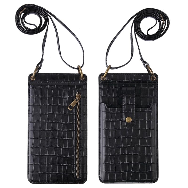 Pakk smarttelefonen, ID-en, kredittkortene og litt penger i denne premium crossbody-vesken, og du er klar til å gå. Den er laget av slitesterk polyuretan av topp kvalitet med krokodilletekstur og legeringsglidelås og spenne som vil se flott og stilig ut. Deretter er det innvendige sminkespeilet praktisk for raskt å sjekke utseendet ditt uansett hvor du er.