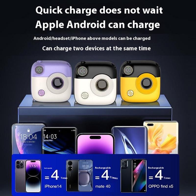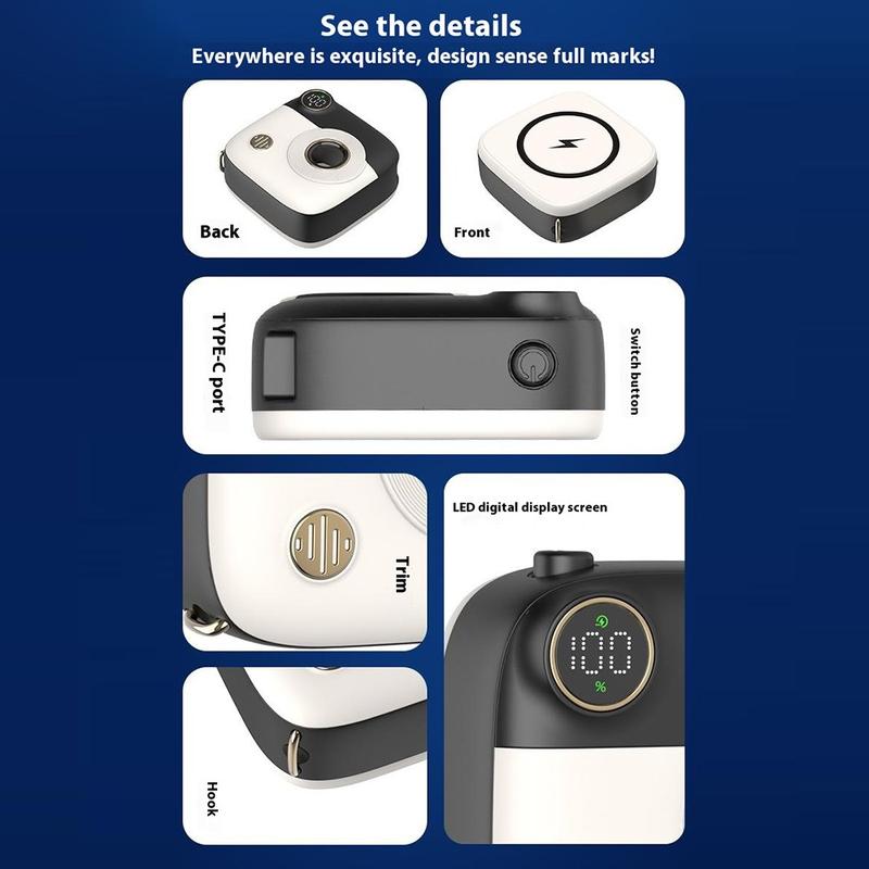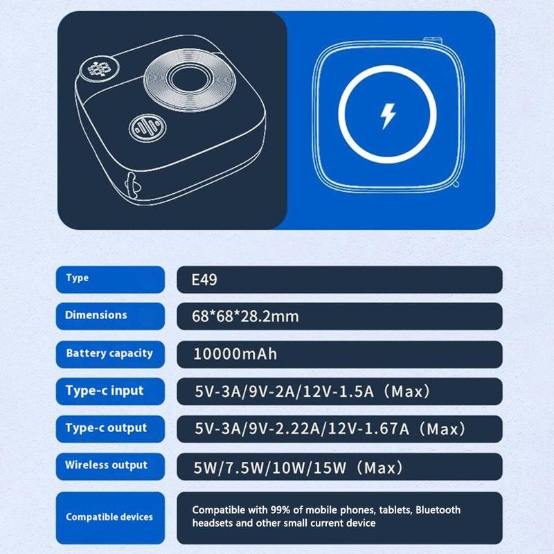 E49 Power Bank er et stilig og funksjonelt tilbehør som er designet for å holde enhetene dine ladet når du er på farten. Med sin unike kameraform ser denne powerbanken ikke bare moteriktig ut, men den har også en kraftig kapasitet på 10 000 mAh. Den støtter rask kablet og trådløs lading, noe som gjør den til et allsidig og praktisk verktøy for reiser, ferier og daglig bruk.