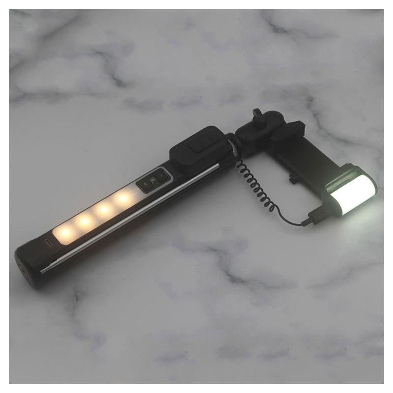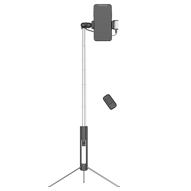 - En multifunksjonell selfiestang med et trebent stativ, en kontrastdempende belysning og en avtakbar kameralukker
