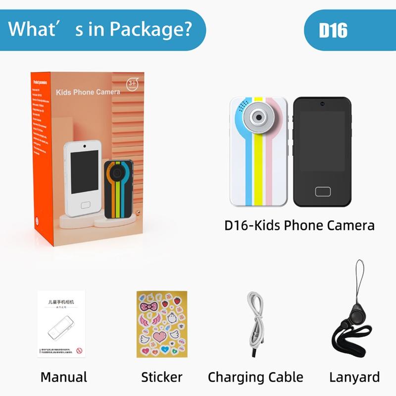 D16 Kids Phone Camera er en barnevennlig enhet som er utviklet for å introdusere de yngste til fotografering og grunnleggende digital interaksjon. Med to kameraer, en responsiv berøringsskjerm og forhåndsinstallerte pedagogiske spill byr den på både underholdning og læringsmuligheter. Det medfølgende minnekortet på 32 GB og kortleseren sørger for rikelig med lagringsplass for bilder og videoer, og den slitesterke designen gjør den egnet for småbarn.