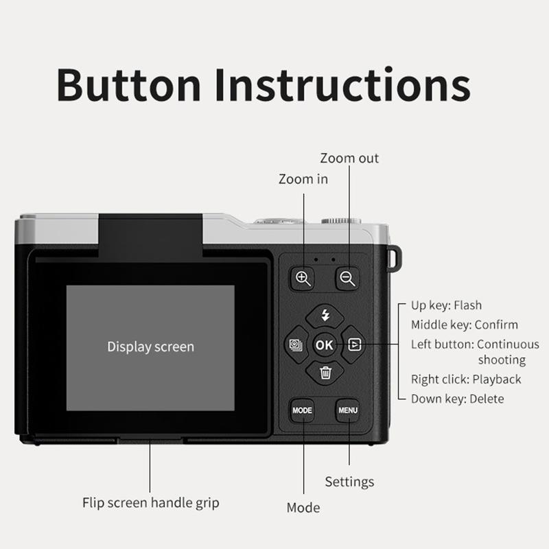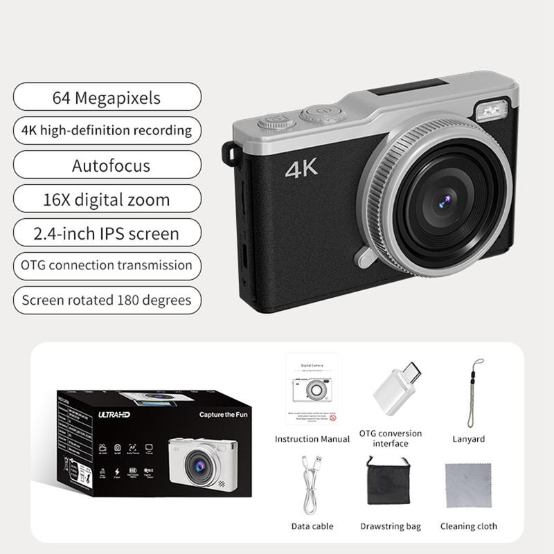 Fang hvert eneste uforglemmelige øyeblikk i levende klarhet med det bærbare 4K-digitalkameraet D72. Dette kompakte, men kraftige kameraet er designet for kreatører, reisende og fotoentusiaster, og tar opp i Ultra HD 4K-oppløsning og tilbyr 16X digital zoom for fantastiske detaljer fra alle avstander. Med den 2,4-tommers 180° vippbare skjermen kan du enkelt ta perfekte selfies og kreative vinkler, mens autofokussystemet sørger for skarpe, naturtro bilder hver gang. Med flere opptaksmoduser, inkludert time-lapse, serieopptak og intervallfotografering, gir D72 deg kreativ frihet til å fortelle historien din på din egen måte. Den retroinspirerte designen kombinerer moderne ytelse med tidløs stil, og med det medfølgende minnekortet på 32GB kan du komme i gang med fotograferingen rett fra esken.