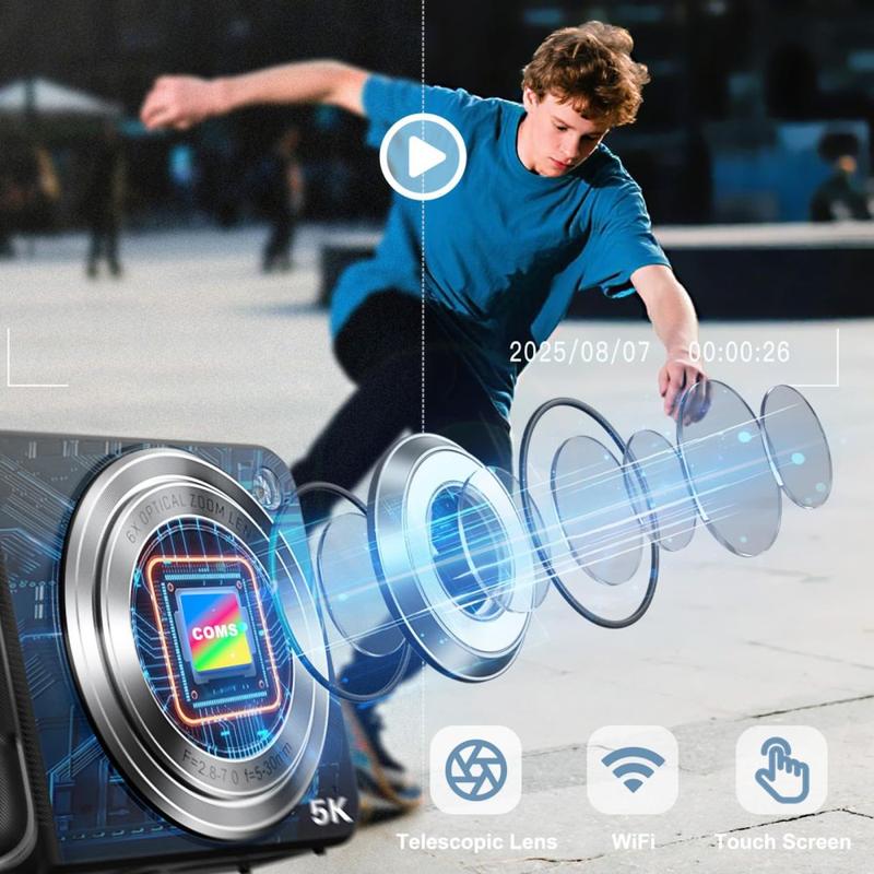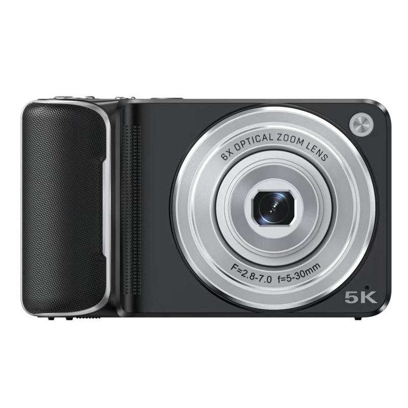 DC309X Mini-digitalkamera - 6X optisk zoom, dobbelt objektiv, 5K videoopptaker med 32GB kort og 2 batterier