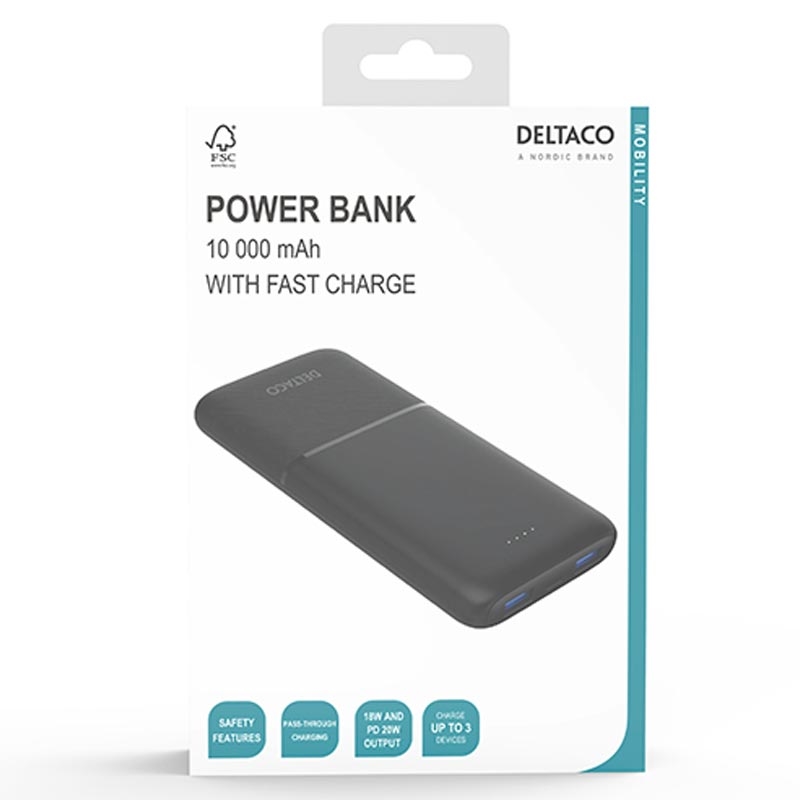 Deltaco 10000mAh powerbank med hurtiglading - svart