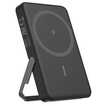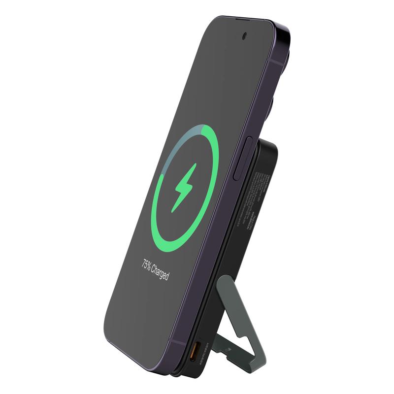 Med opptil 15 W trådløs lading for kompatible enheter og opptil 7,5 W for iPhones, gjør den kabelfri lading enkelt. Den innebygde magneten er kompatibel med Apples magnetiske løsning og lignende systemer, noe som hjelper med å holde powerbanken på plass under bruk. Det integrerte stativet gir ekstra fleksibilitet, noe som gjør det enklere å se på videoer, surfe eller delta i samtaler mens telefonen lades.