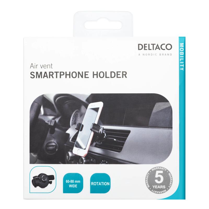 Deltaco ARM-238 Universal Air Vent Car Holder er et praktisk og brukervennlig tilbehør til bilen. Den er designet for å holde smarttelefoner med en bredde på 60-88 mm, noe som gjør den kompatibel med et bredt spekter av enheter. Holderen er lett, veier bare 62 g og er kompakt med målene 87x86x56 mm. Den kan enkelt settes inn i lufteventilen i bilen, slik at du har en sikker og lett tilgjengelig plassering for smarttelefonen mens du kjører.