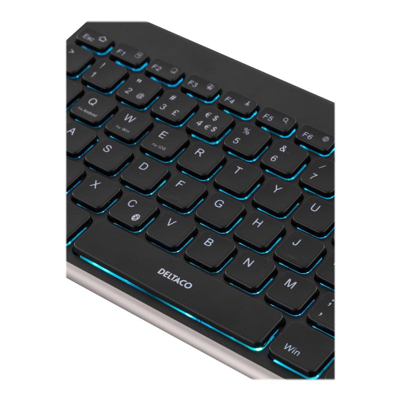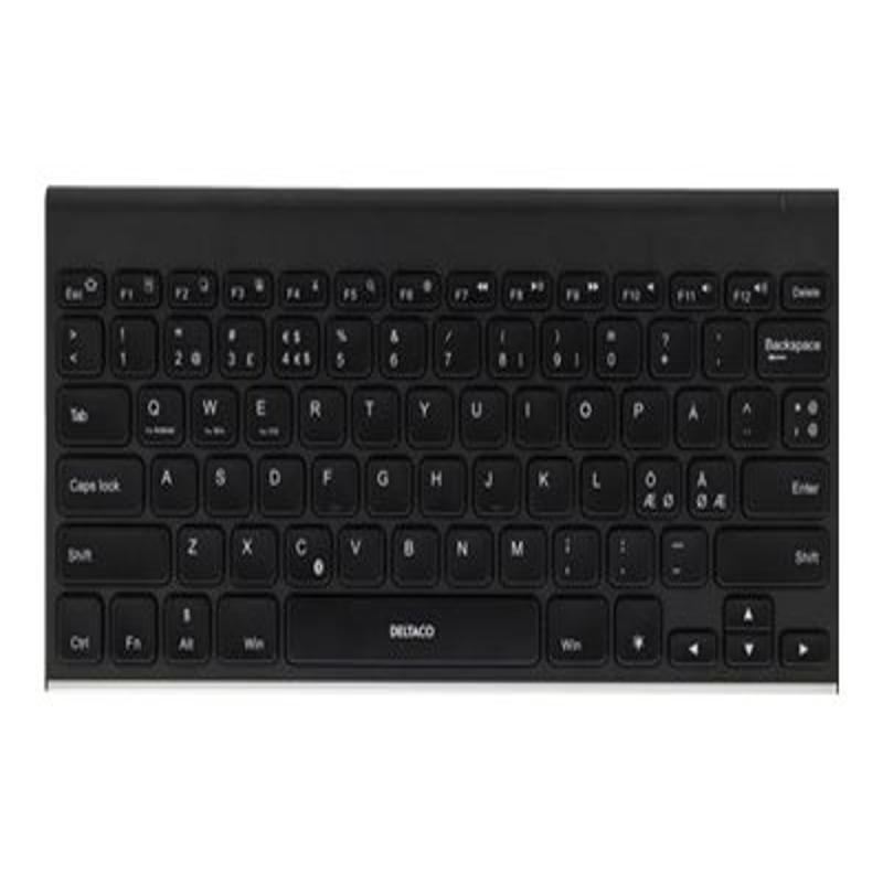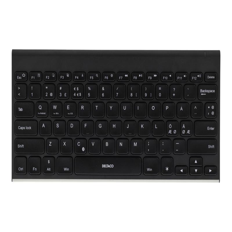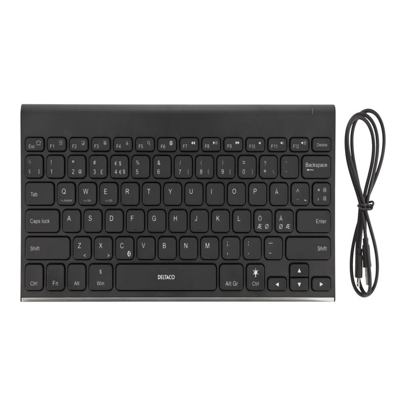DELTACO trådløst miniTastatur, lav støy, bakgrunnsbelyst, innbygget batteri, Bluetooth, 10m, Svart.