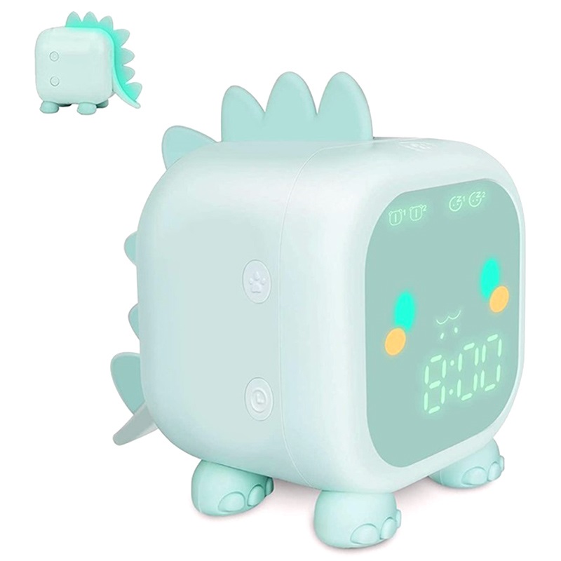 Lag et ideelt sovemiljø for barna dine med denne søte dinosaur nattlampen og vekkerklokken. Den har en dobbel alarmfunksjon for å utvikle gode søvnvaner for barnet ditt. Aktiver en slumrefunksjon ved å trykke på den lille knappen øverst på nattlyset, så får du 5 ekstra minutter for å sove. Den digitale vekkerklokken er utstyrt med soloppgang og solnedgang, hvor lyset sakte går fra mørkest til lettest, eller omvendt, for å våkne lett om morgenen og gi et godt nattemiljø. Barnet ditt vil føle seg trygt i mørket fordi du kan stille nattmodus slik at lyset slukkes etter 60 minutter, noe som er nok tid til å sovne. Unn dine barn denne søte dinosaur nattlampen og vekkerklokken fordi den er den perfekte gaven!