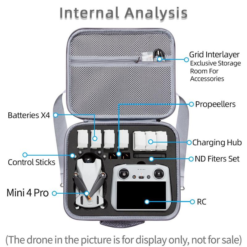 - Tilpasset design: Kofferten er skreddersydd spesielt for DJI Mini 4 Pro, og har presise rom for sikker oppbevaring av dronen, fjernkontrollen med skjerm, tre batterier, ladehub, lader og annet småtilbehør.