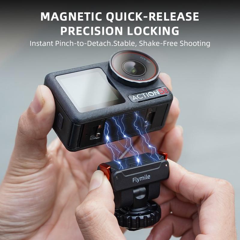 Flymile magnetisk feste har en presis låsemekanisme for rask montering og demontering. Klem-og-slipp-designet gir et fast grep med minimal vingling - ideelt for stabile opptak under actionfilming.