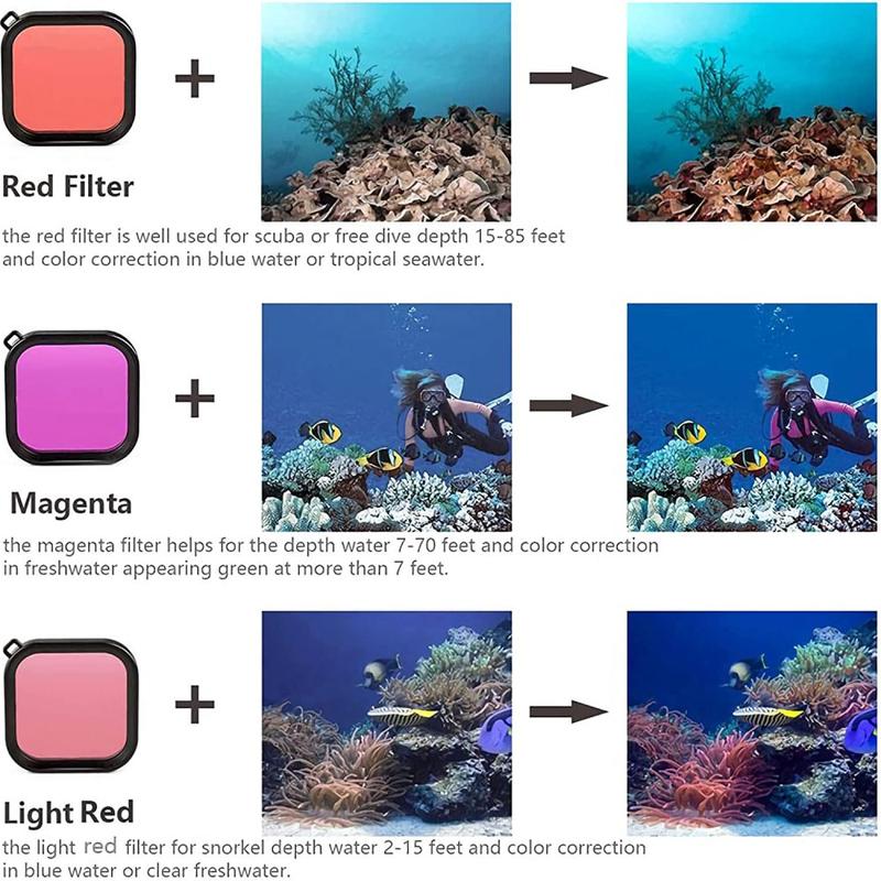 - Undervannsfiltrene hjelper med å gjenopprette farger som absorberes på dybden, og forbedrer dermed naturtro opptak
