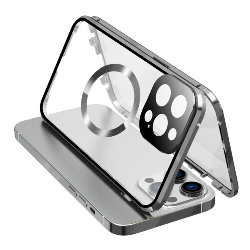 Dobbeltsidig herdet glass + magnetisk metallramme Anti-Drop Case for iPhone 15 Kompatibel med MagSafe Phone Cover med spennelås - Sølv