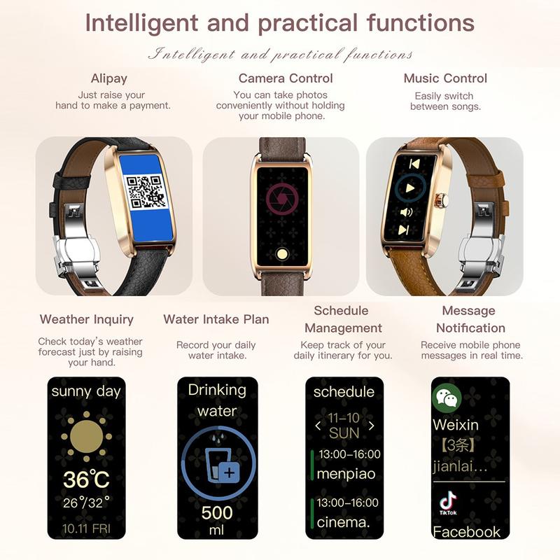 Hold deg organisert og tilkoblet med en rekke smarte verktøy: Alipay-støtte, musikkstyring, fjernstyrt kamera, vibrasjonsvarsler, meldingsvarsler, væroppdateringer, påminnelser om væskebalanse og tidsplanstyring. Den er designet spesielt for kvinner, og inkluderer også menstruasjonssporing og dimming av skjermen i nattmodus for avslappende kvelder.