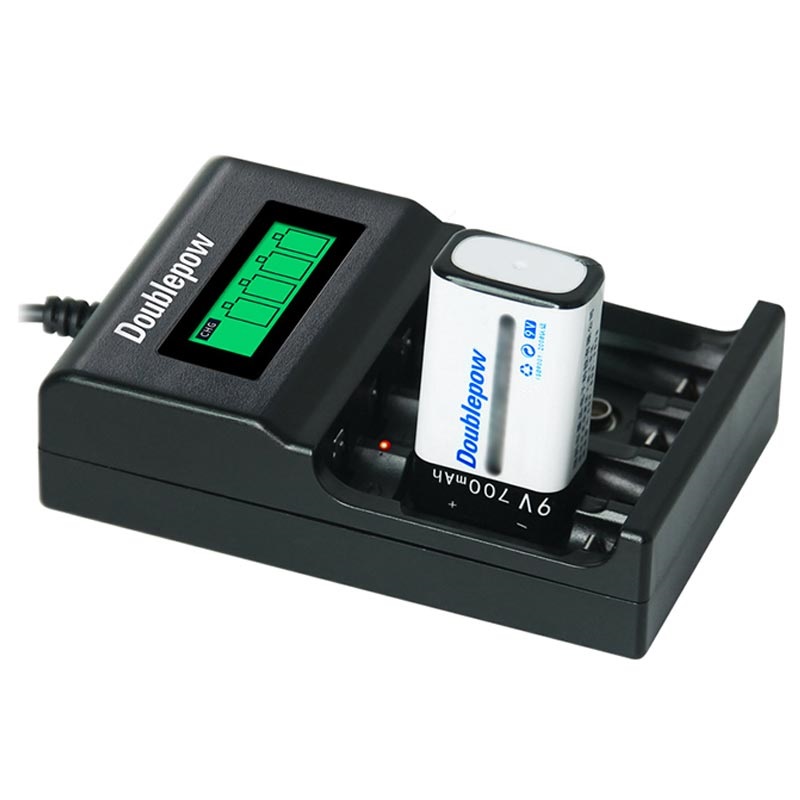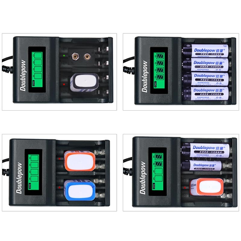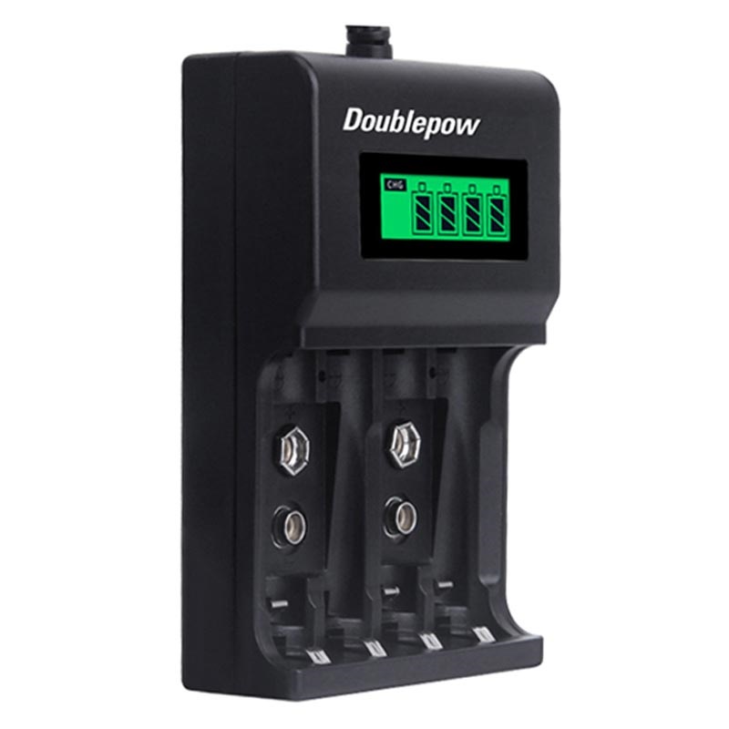 Doublepow DP-UK95 hurtiglader kan lade opptil fire AA/AAA eller opptil to 9V blokkeringsbatterier samtidig. Den er designet med et LCD display som viser ladenivået til AA/AAA-batterier, mens LED-indikatoren viser ladestatus for 9V-batterier.