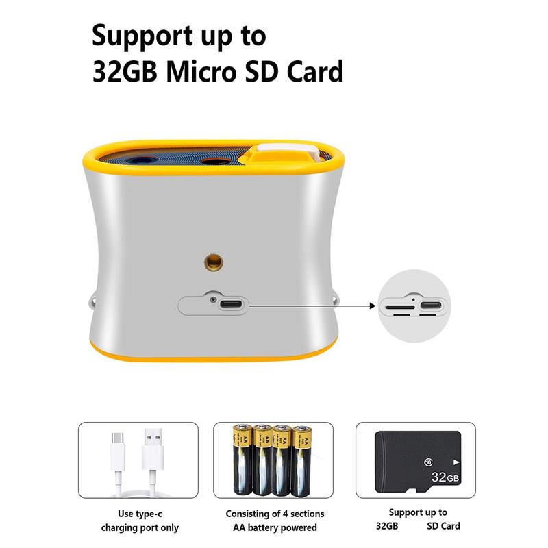 DT15 drives av 4 × AA-batterier eller Type-C-lading, noe som gjør den praktisk for reise- og utendørsbruk. Den lette designen og det medfølgende snøret gjør at barna kan bære den trygt og komfortabelt. Lagringsminnet kan utvides med et 32 GB microSD-kort (ikke inkludert).